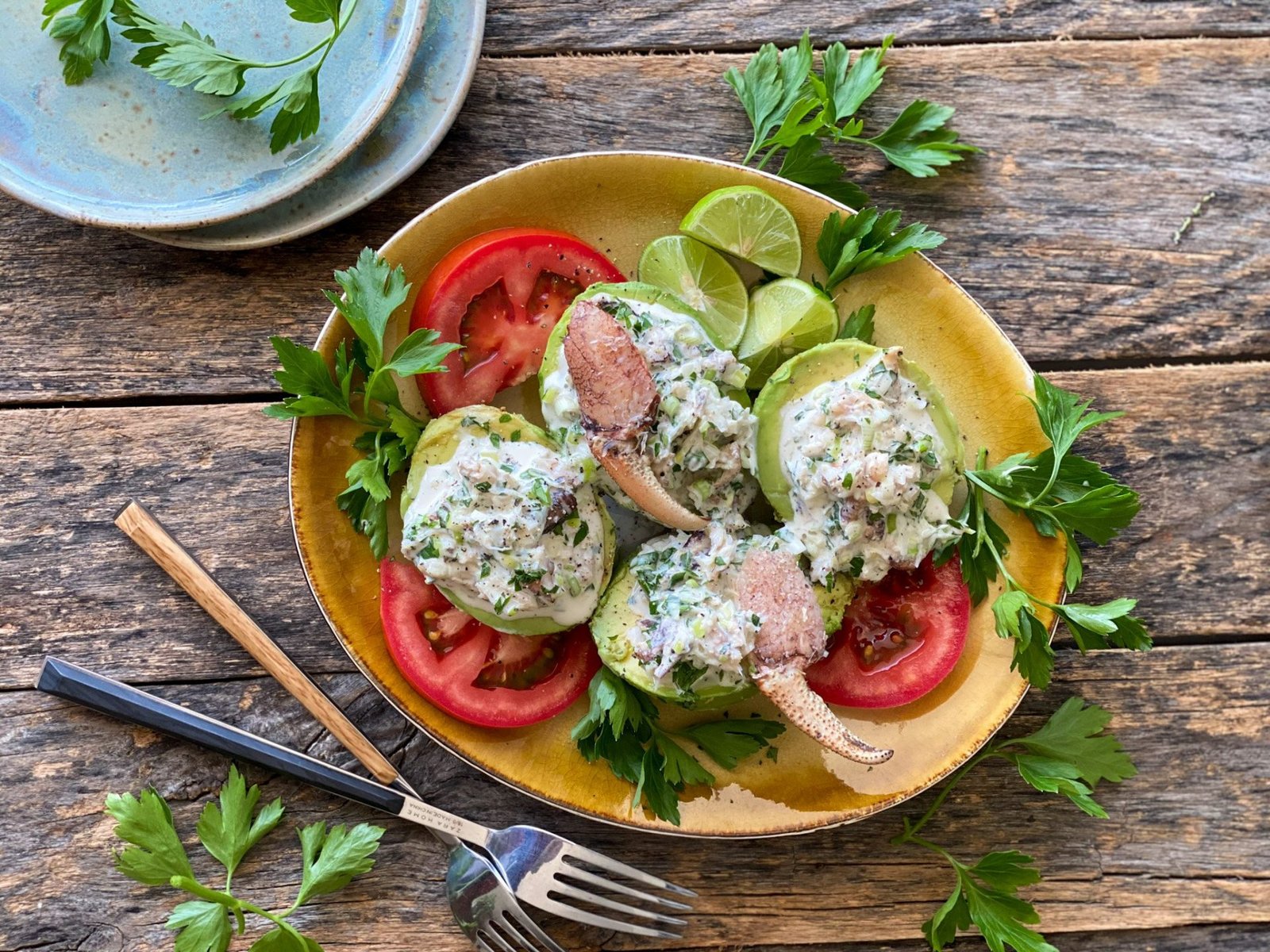 - Rellenar los aguacates con la mezcla de cangrejo y espolvorear con un poco más de perejil picado encima. Si tienen patitas gordas de cangrejo, pongan una encima de cada aguacate.