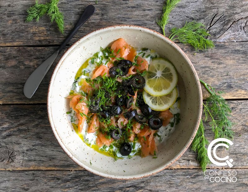 1. En la base de un bowl esparcir el tzatziki. Encima poner el salmón ahumado picado, las aceitunas, eneldo, cebollín y aceite de oliva.