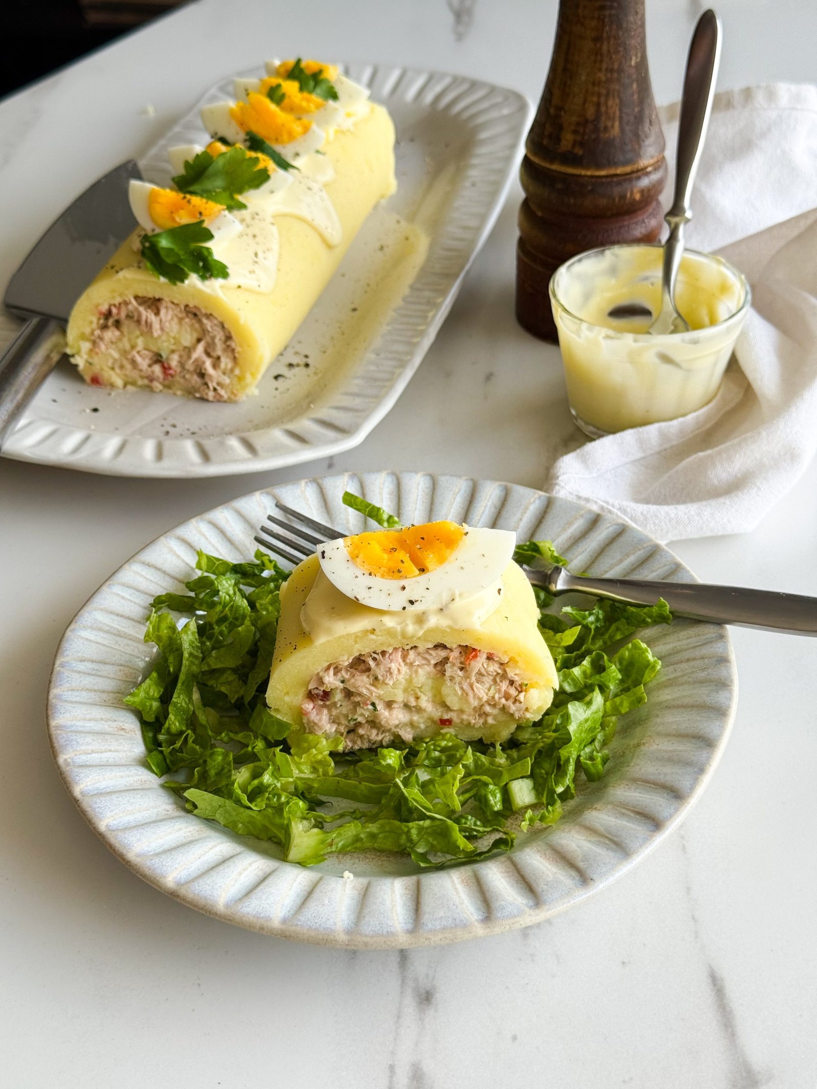 Una entrada fresca y muy común en muchas casas, no así en la mía. La verdad no recuerdo haberla comido en mi infancia chilena, pero sí, y mucho aquí en Guayaquil. Es realmente un clásico. Me gusta usar la papa chola, bien amarilla, que le da textura, color y sabor. Luego un buen atún mezclado con verduras frescas y el toque de limón que lo eleva aún más.