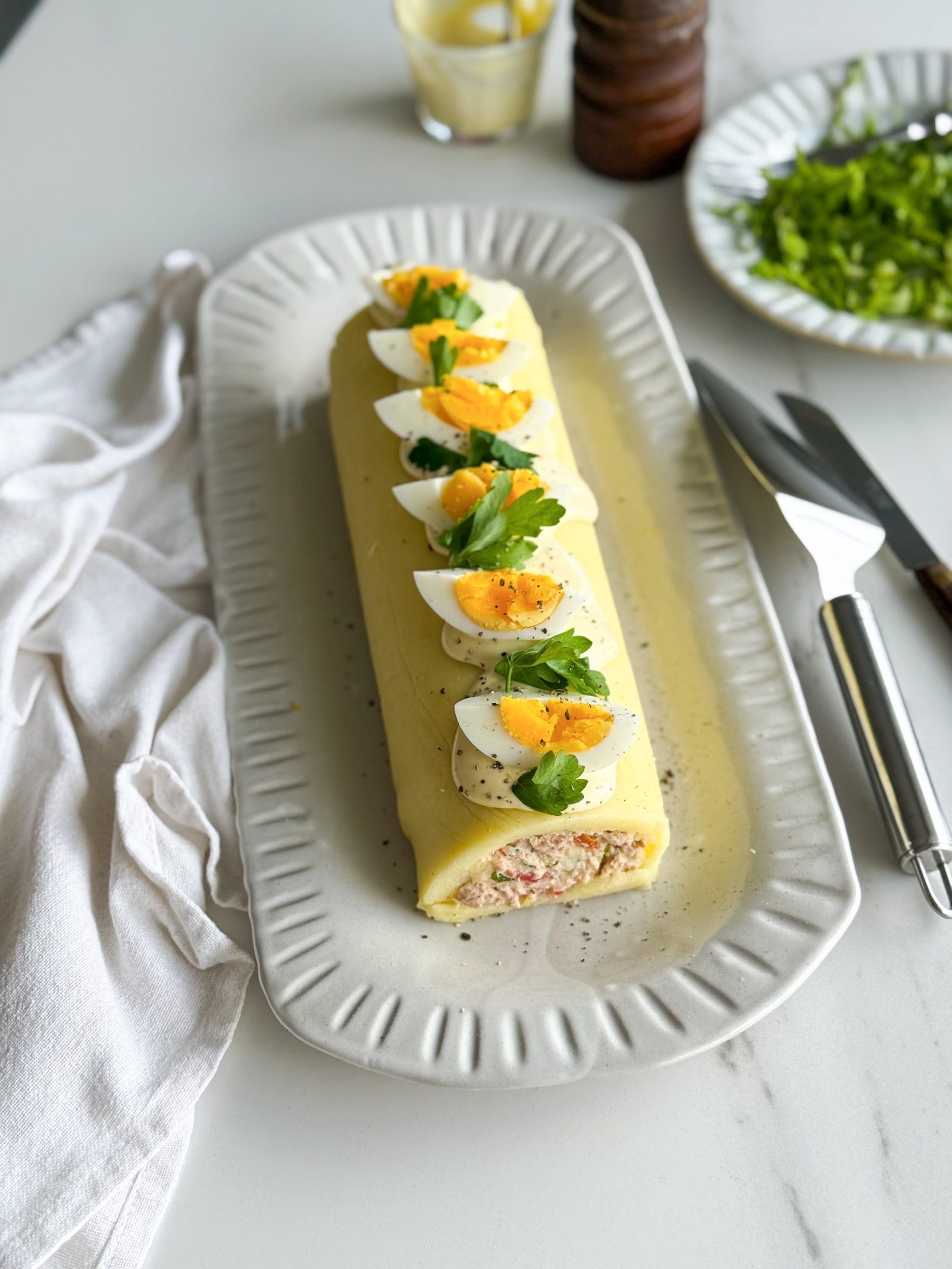 Me gusta hacerlo y conservarlo enrollado en el mismo papel hasta el momento de servir. Es ideal servirlo en rebanadas, sobre lechuga picada, a manera de entrada y tener unas cuñas de limón en la mesa para acompañar.