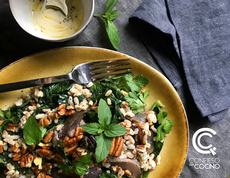 Me he inspirado para hacer esta ensalada de cebada perlada con espinaca y cebolla asada, en un paquete de farro que traje de mis vacaciones en Europa. El farro es un tipo de trigo integral que se usa mucho para ensaladas y el cual se puede reemplazar perfectamente por la cebada perlada.