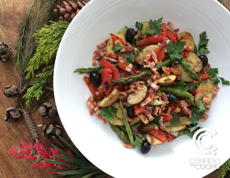 - Poner dentro de la fuente que vayan a llevar a la mesa: papas, espárragos, pimientos, aceitunas, tocino y hojitas de perejil.