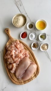 Estos nuggets de pollo están hechos con pechuga de pollo molida, huevo y condimentos. Se les da forma de croquetas aplastadas, se pasan por panko y se cocinan al horno.
