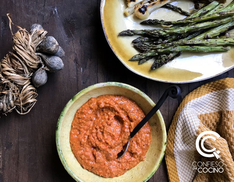 • Pueden servir la salsa romesco como lo he hecho yo, con cebolletas (cebollas chinas o de verdeo) y espárragos a la parrilla. Pero  también es exquisita con pescado, pollo, pulpo, cordero o  con vegetales como alcachofas y berenjenas.