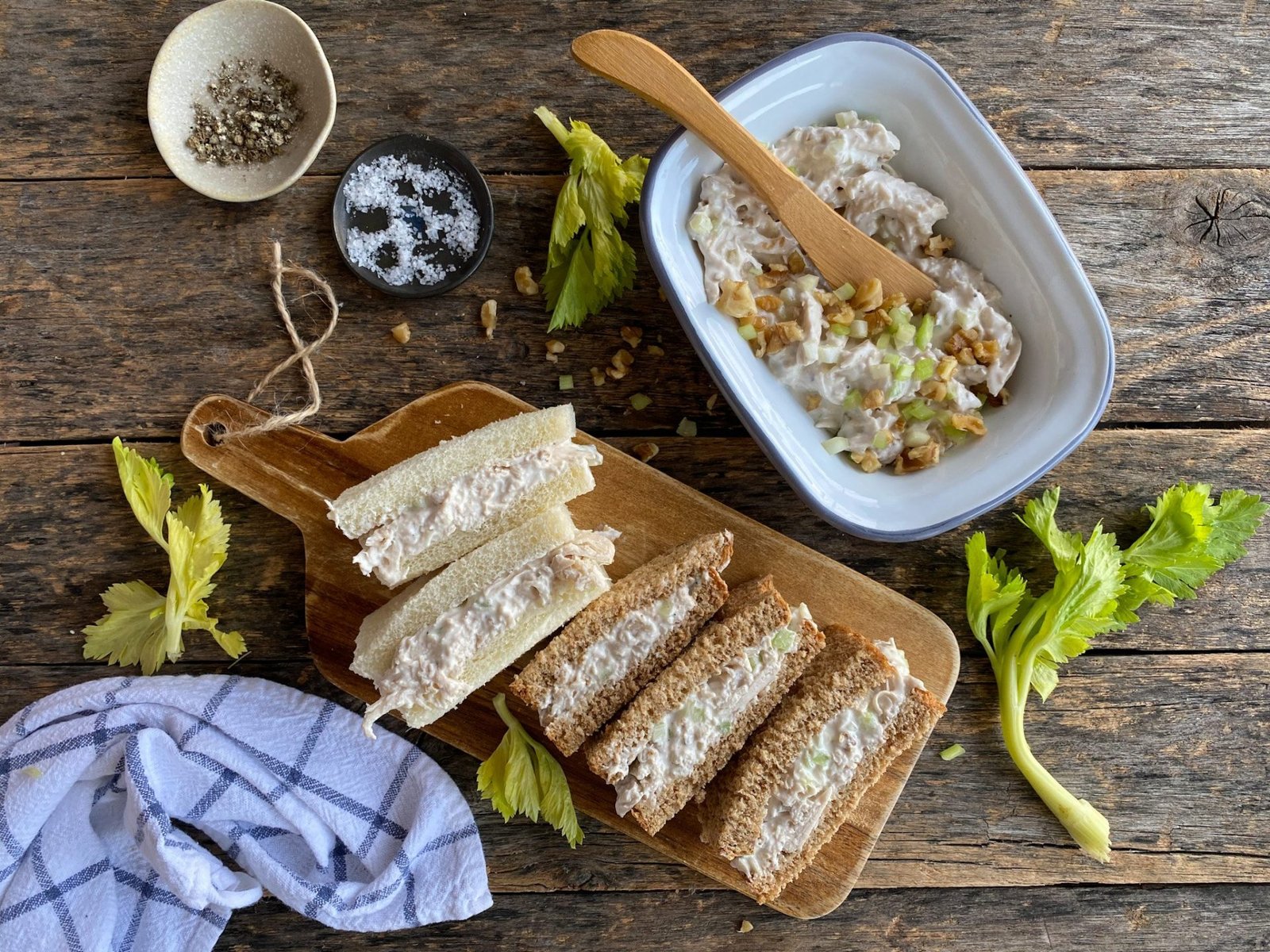 - En una fuente mezclar el pollo con el apio, mayonesa, yogur, mostaza, sal y pimienta. Agregar las nueces picadas y terminar de unir.