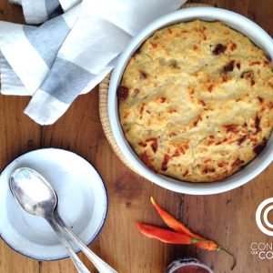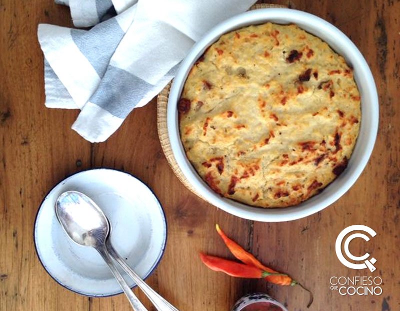 Bueno, el detonante esta vez fue un plato muy de aquí: mote con chicharrón. Nos encanta pedirlo en un restorán de comida típica (Mi Cocina) donde lo hacen delicioso. Y por otro lado el recuerdo de los almuerzos familiares, donde preparaban esta torta de mote sólo con queso. Entonces pensé: ¿por qué no agregarle chicharrón? Y esto es lo que hice…
